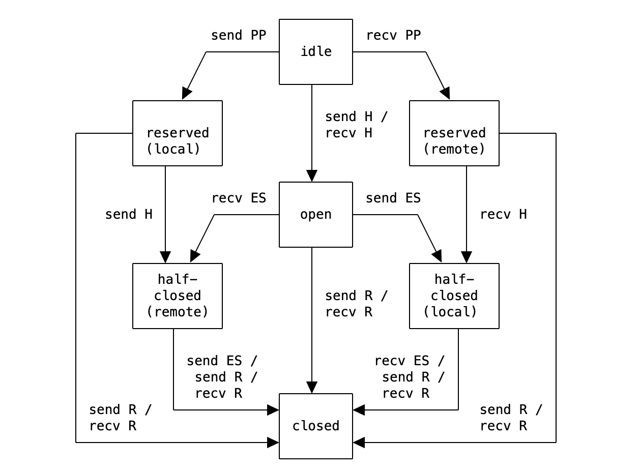 HTTP/2的流会经过一些生命周期状态。客户端发送HEADERS帧以开启一个HTTP请求(比如GET请求),服务器响应此请求,然后流结束。这个过程经历如下状态: