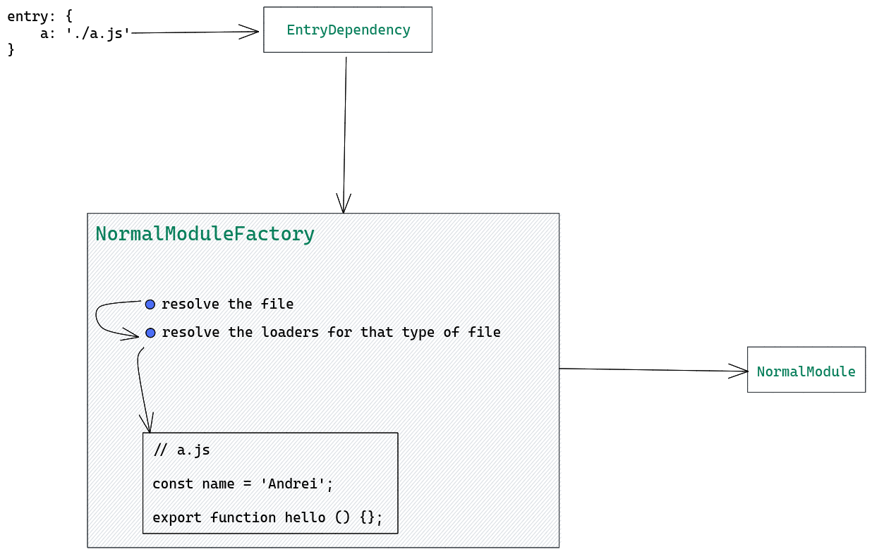 - 根据 entry 对应的 dependence 创建 Module 对象,调用相关 loader,将入口文件的内容转换成标准的 JS;