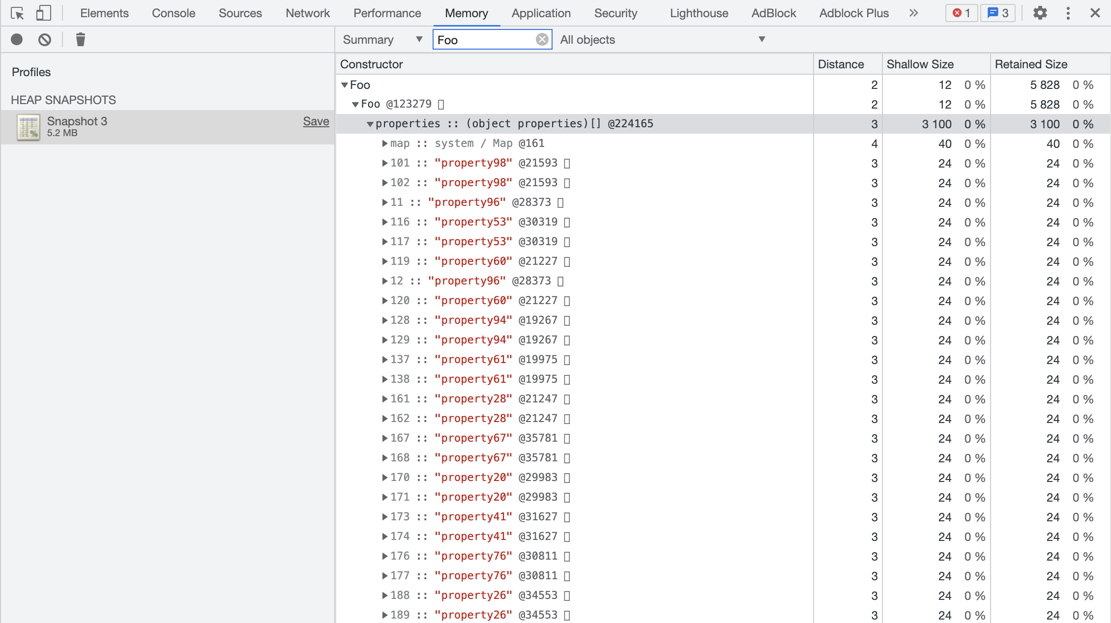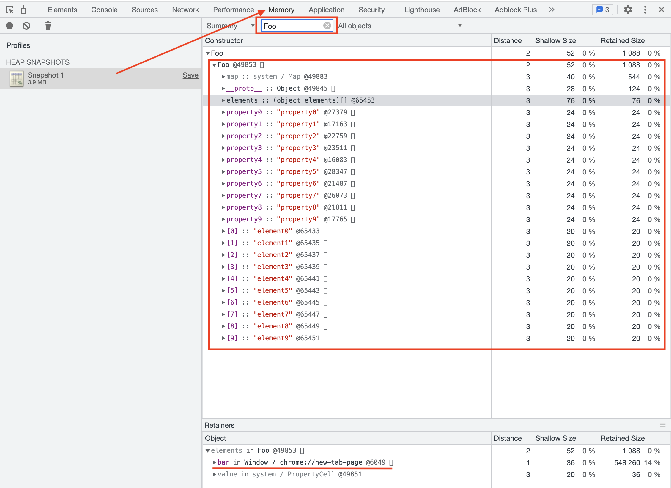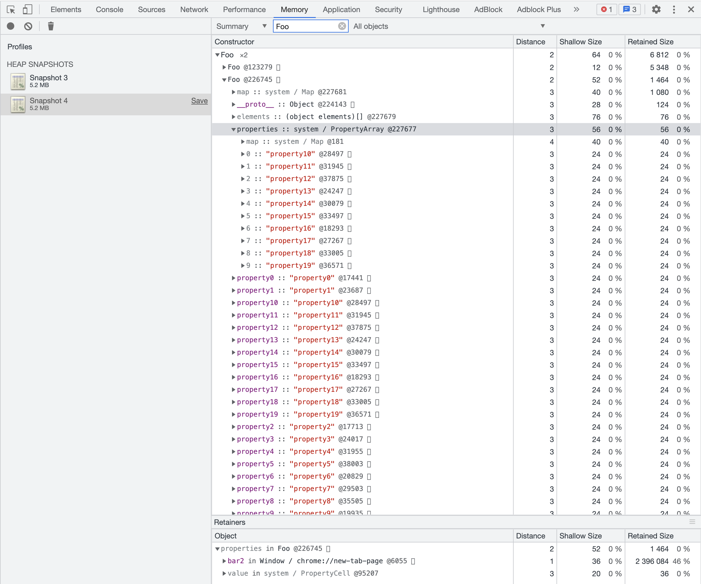 观察上图,我们搜索出来了所有经过构造函数 Foo 创建的对象,点开 Foo 的那个下拉列表,第一个就是刚才创建的 bar 对象,我们可以看到 bar 对象有一个 elements 属性,这里面就包含我们创造的所有的排序属性,那么怎么没有常规属性对象呢?