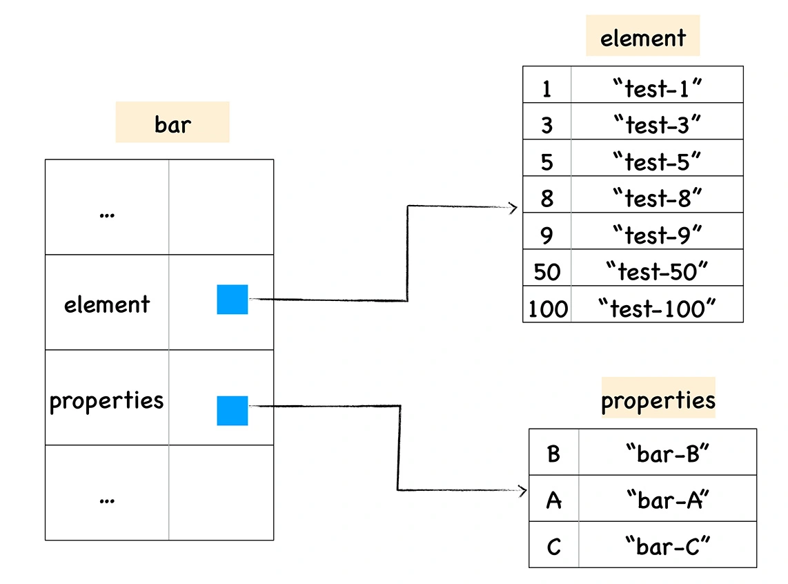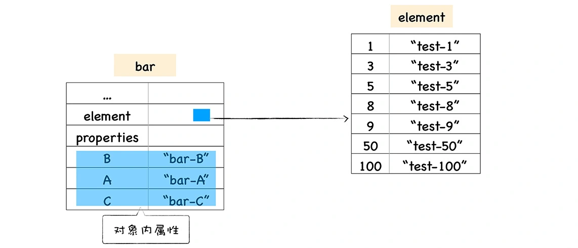 通过上图我们可以发现,bar 对象包含了两个隐藏属性:elements 属性和 properties 属性,elements 属性指向了 elements 对象,在 elements 对象中,会按照顺序存放排序属性,properties 属性则指向了 properties 对象,在 properties 对象中,会按照创建时的顺序保存了常规属性。