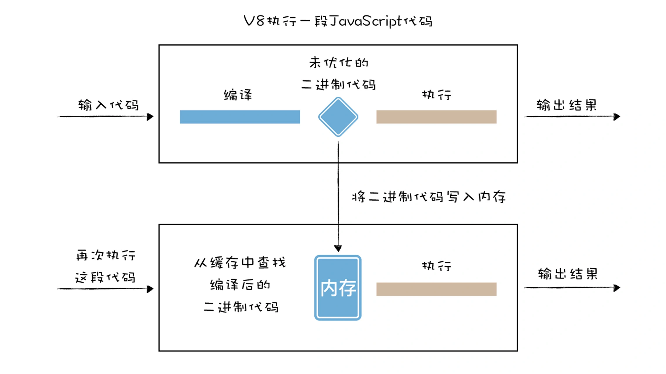从图中可以看出,编译所消耗的时间和执行所消耗的时间是差不多的,试想一下,如果在浏览器中再次打开相同的页面,当页面中的 JavaScript 文件没有被修改,那么再次编译之后的二进制代码也会保持不变, 这意味着编译这一步白白浪费了 CPU 资源,因为之前已经编译过一次了。