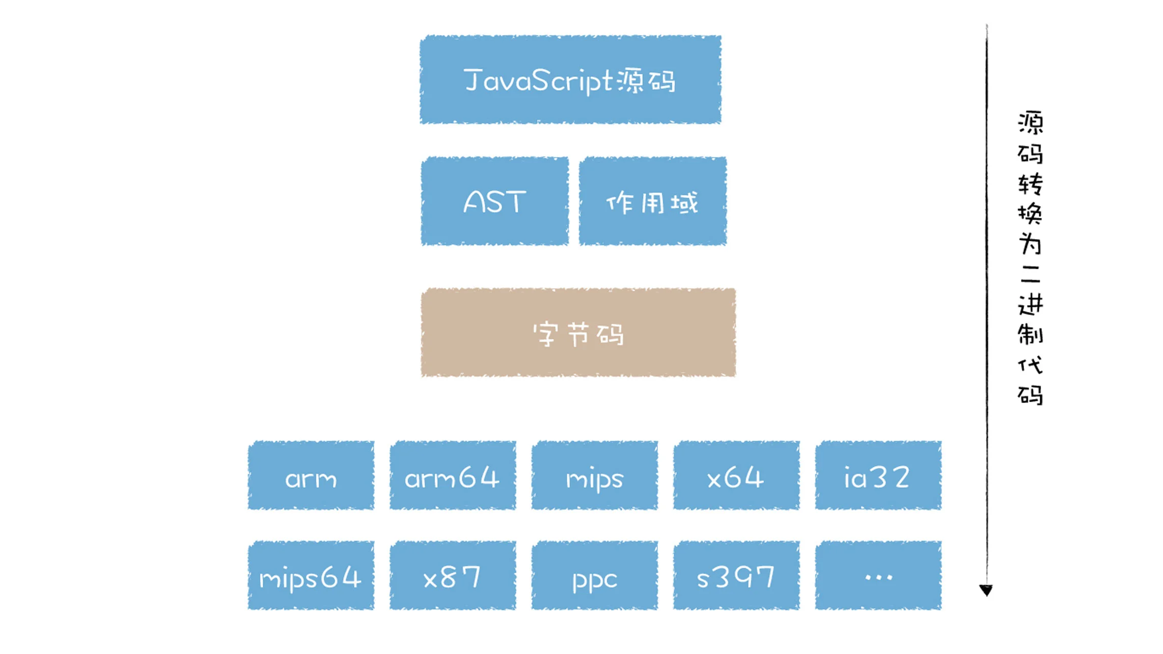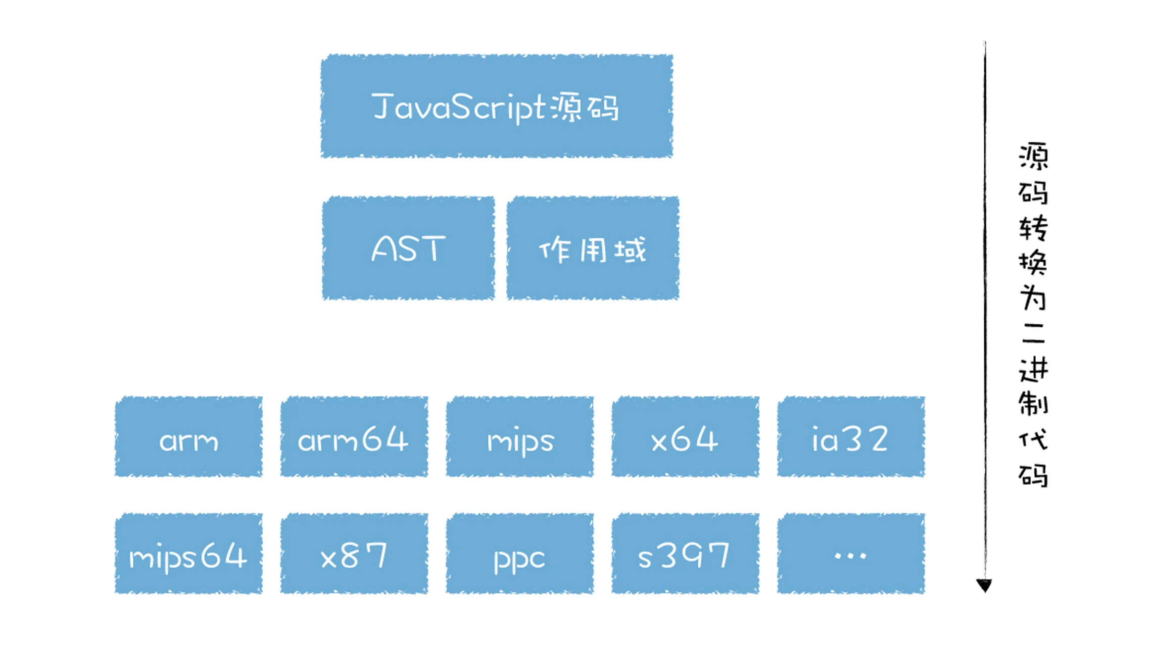早期的 V8 代码,无论是基线编译器还是优化编译器,它们都是基于 AST 抽象语法树来将代码转换为机器码的,我们知道,不同架构的机器码是不一样的,而市面上存在不同架构的处理器又是非常之多,你可以参看下图: