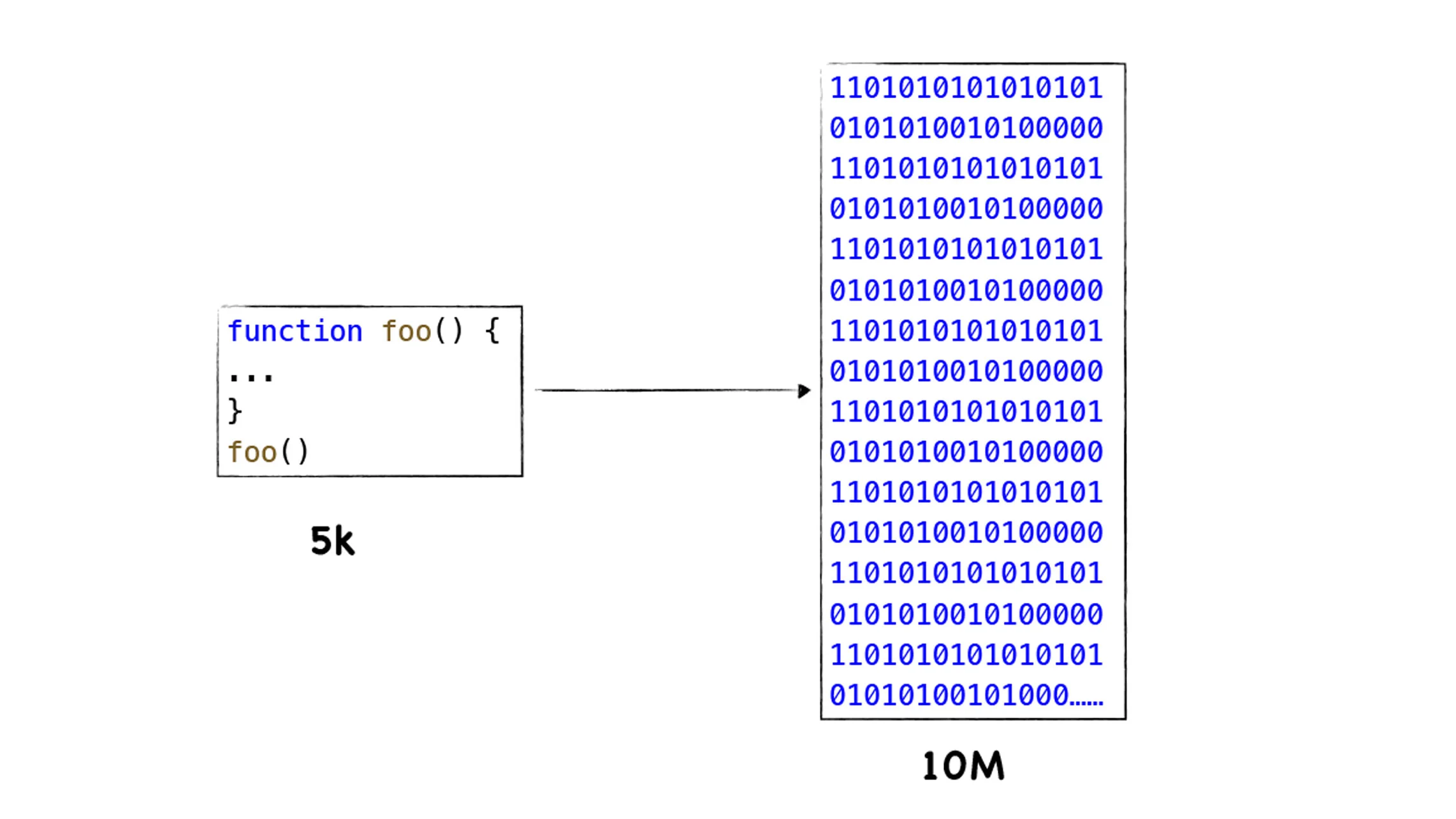 很明显,采用缓存是一种典型的以空间换时间的策略,以牺牲存储空间来换取执行速度,我们知道 Chrome 的多进程架构已经非常吃内存了,而 Chrome 中每个页面进程都运行了一份 V8 实例,V8 在执行 JavaScript 代码的过程中,会将 JavaScript 代码转换为未经优化的二进制代码,你可以对照下图中的 JavaScript 代码和二进制代码的: