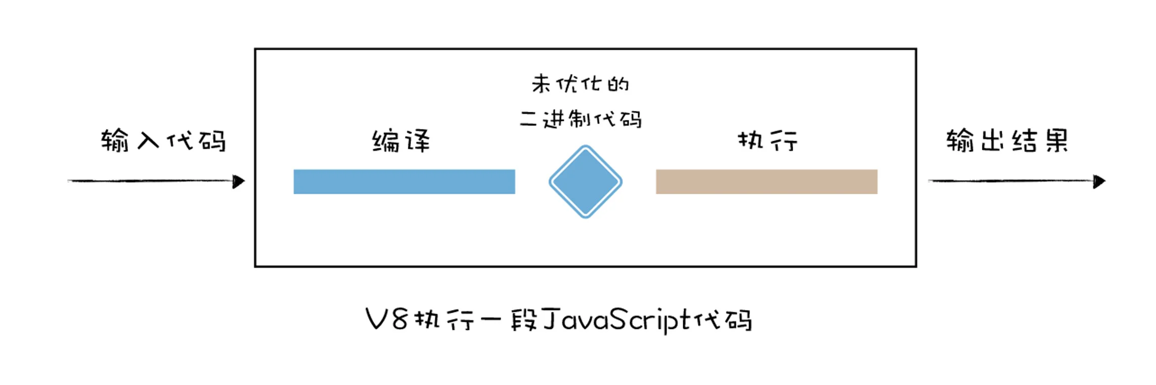 当 JavaScript 代码在浏览器中被执行的时候,需要先被 V8 编译,早期的 V8 会将 JavaScript 编译成未经优化的二进制机器代码,然后再执行这些未优化的二进制代码,通常情况下,编译占用了很大一部分时间,下面是一段代码的编译和执行时间图: