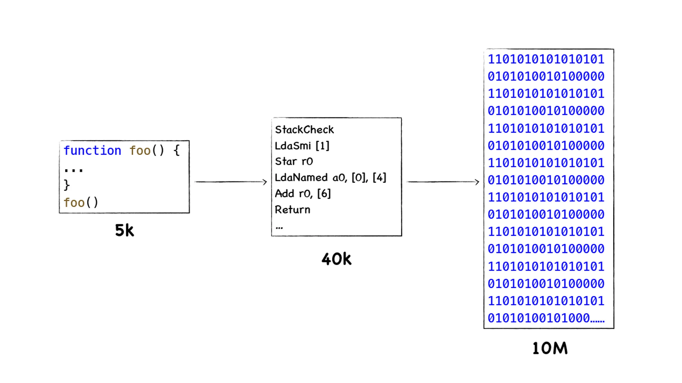 不过随着移动设备的普及,V8 团队逐渐发现将 JavaScript 源码直接编译成二进制代码存在两个致命的问题: