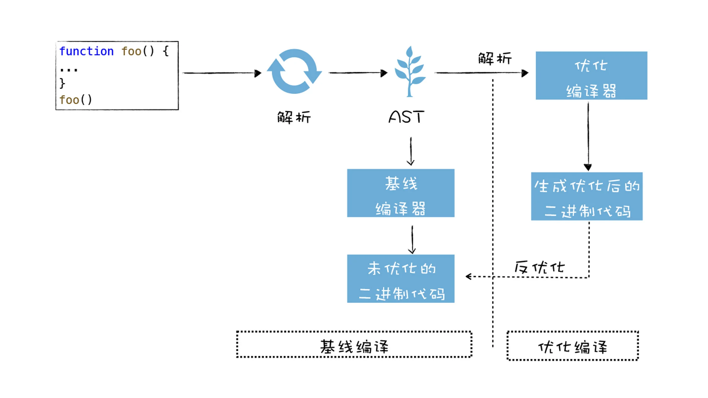 - 不过如果优化过的二进制代码并不能满足当前代码的执行,这也就意味着优化失败,V8 则会执行反优化操作。
