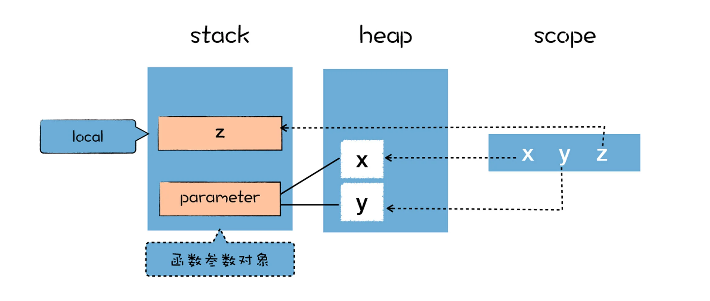 }作用域中的变量都是未使用的,默认值都是 undefined,在执行阶段,作用域中的变量会指向堆和栈中相应的数据,作用域和实际数据的关系如下图所示: