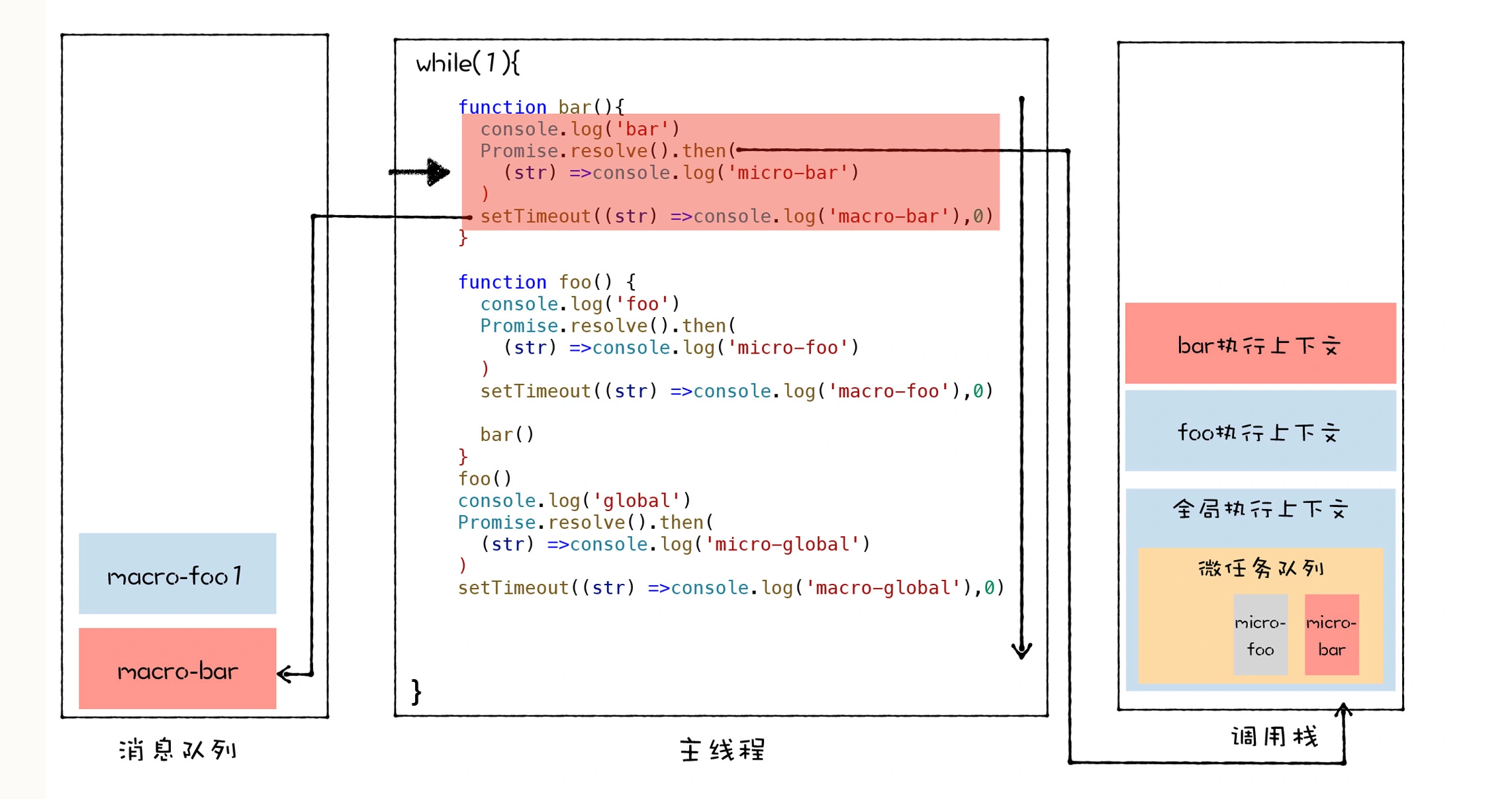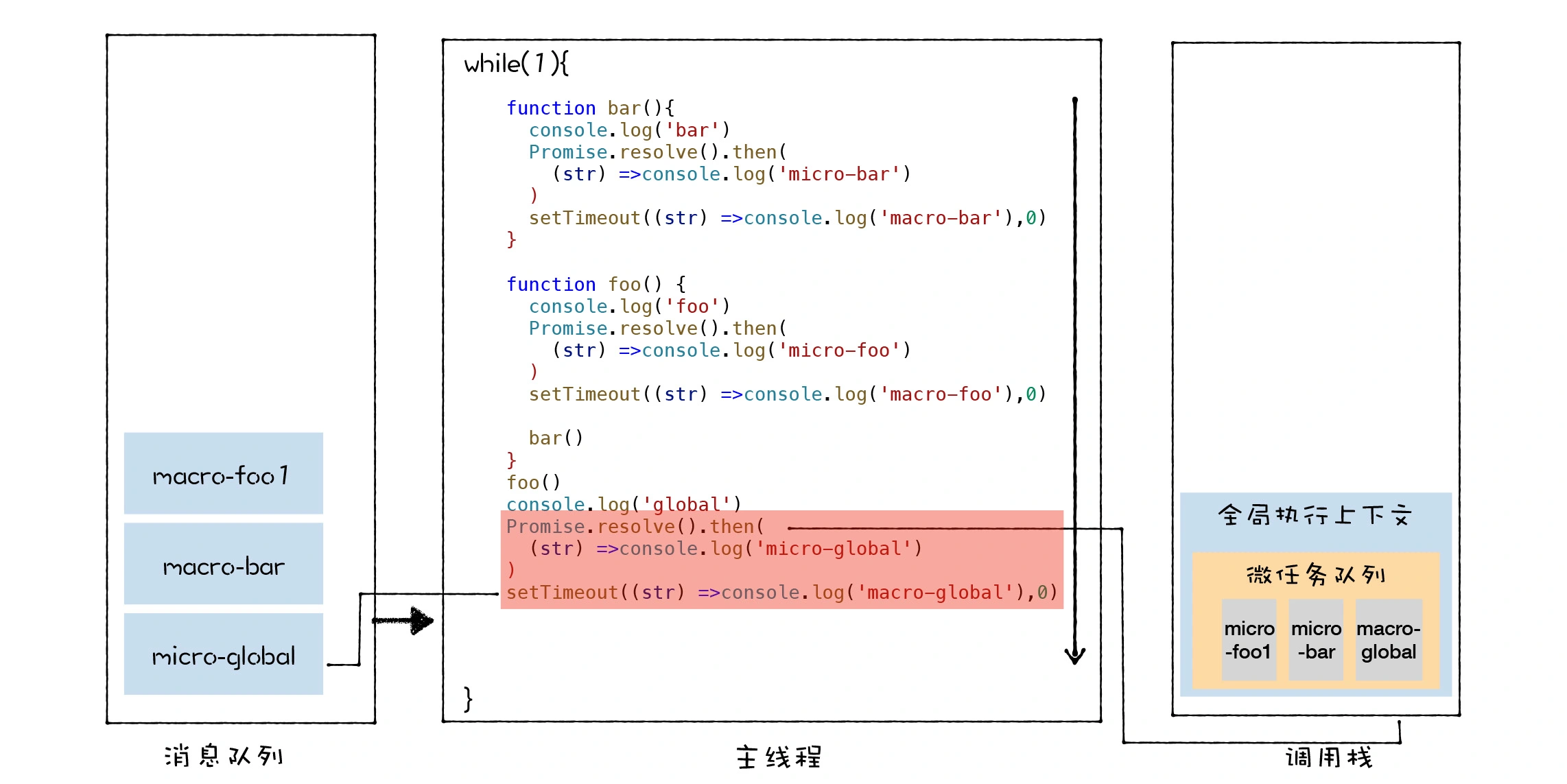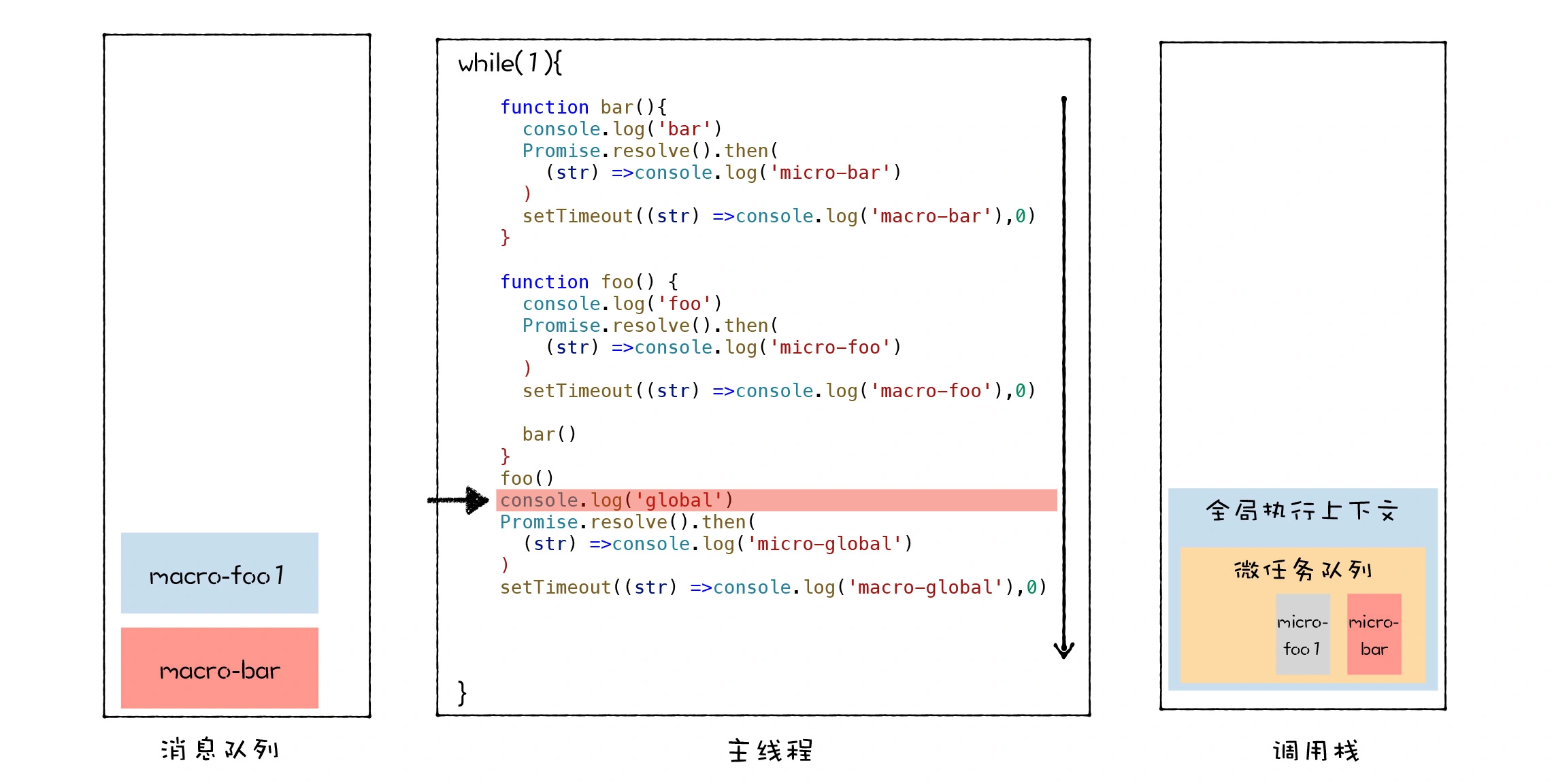 setTimeout((str) =>console.log('macro-global'),0)foo