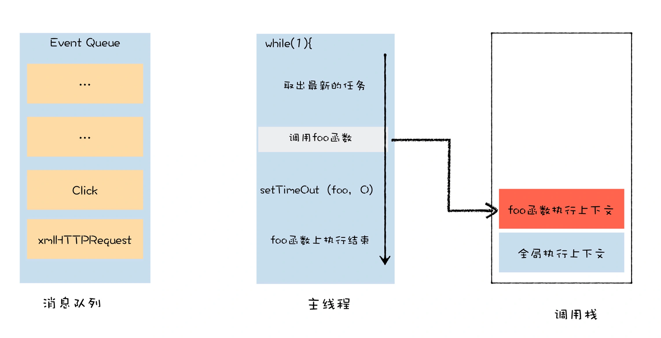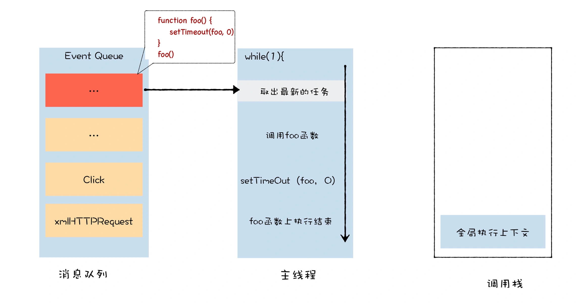 当一个宏任务执行结束之后,忙碌的主线程依然不会闲下来,它会一直重复这个取宏任务、执行宏任务的过程。刚才通过 setTimeout 封装的回调宏任务,也会在某一时刻被主线取出并执行,这个执行过程,就是 foo 函数的调用过程。具体示意图如下所示: