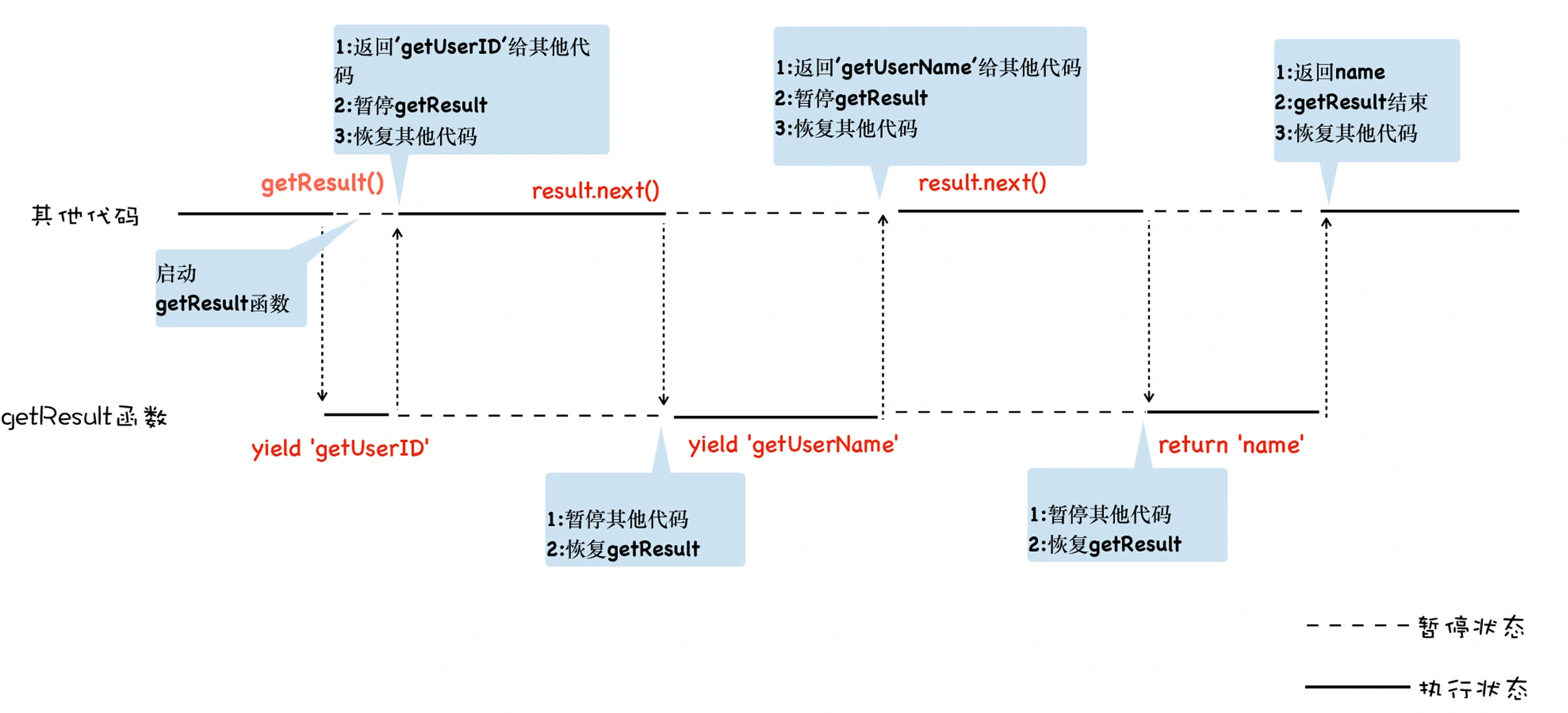 return result.next(response).value这样,我们可以将同步、异步逻辑全部写进生成器函数 getResult 的内部,然后,我们在外面依次使用一段代码来控制生成器的暂停和恢复执行。以上,就是协程和 Promise 相互配合执行的大致流程。