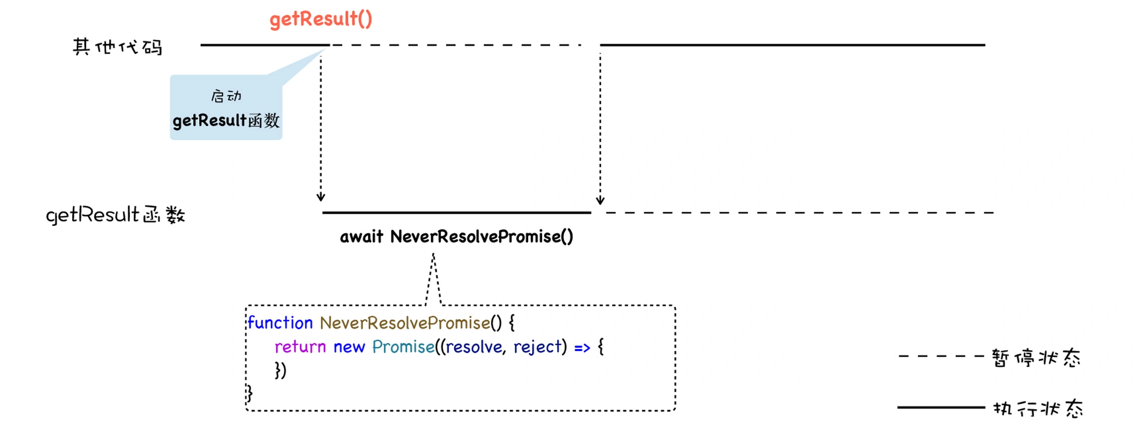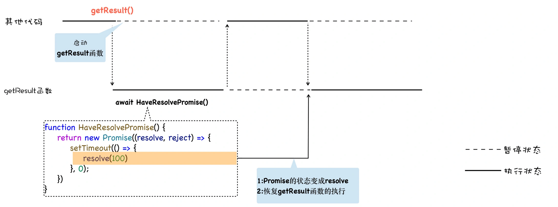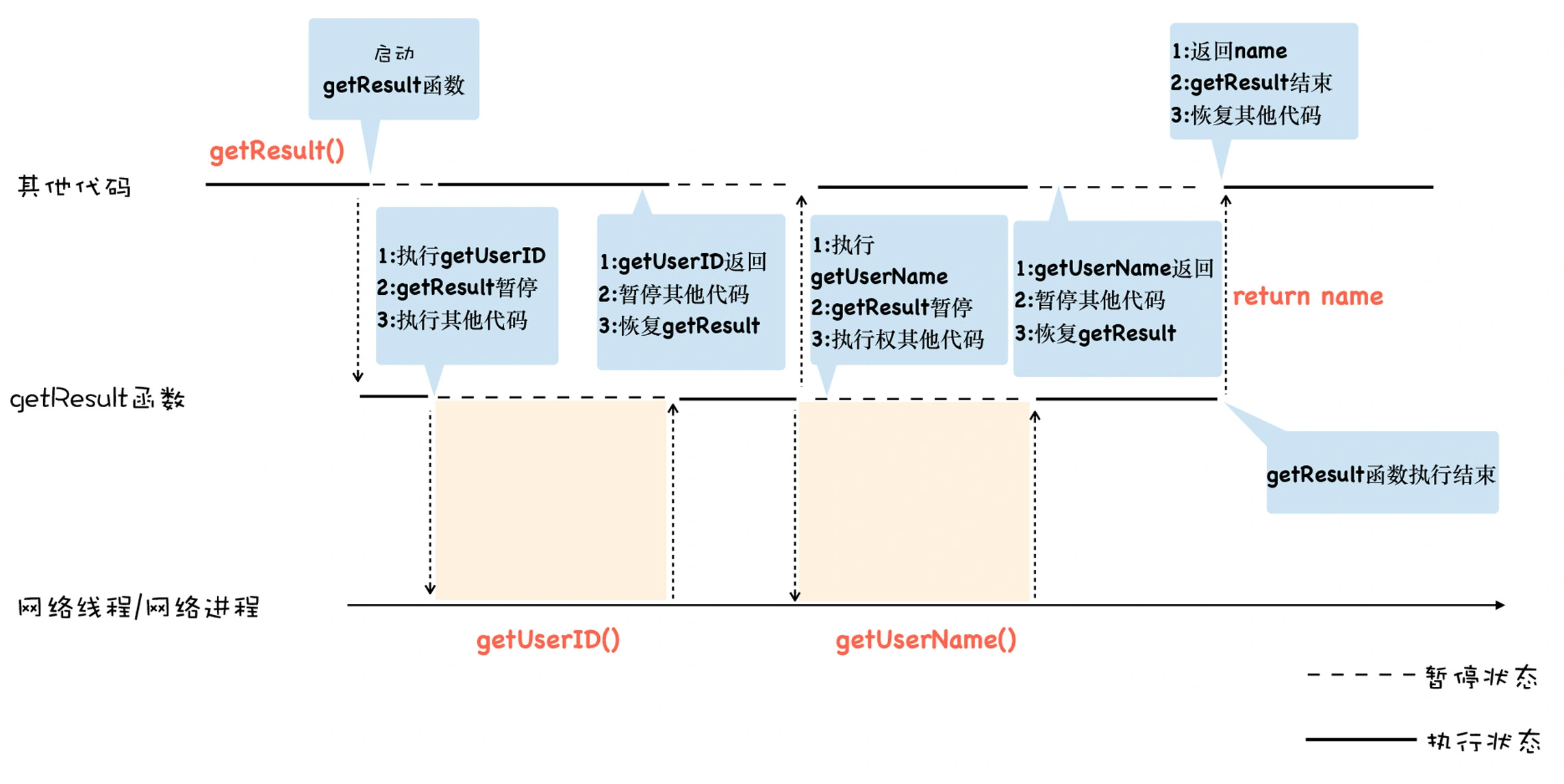 getResult()虽然这种方式看起来像是同步代码,但是实际上它又是异步执行的,也就是说,在执行到 await fetch 的时候,整个函数会暂停等待 fetch 的执行结果,等到函数返回时,再恢复该函数,然后继续往下执行。